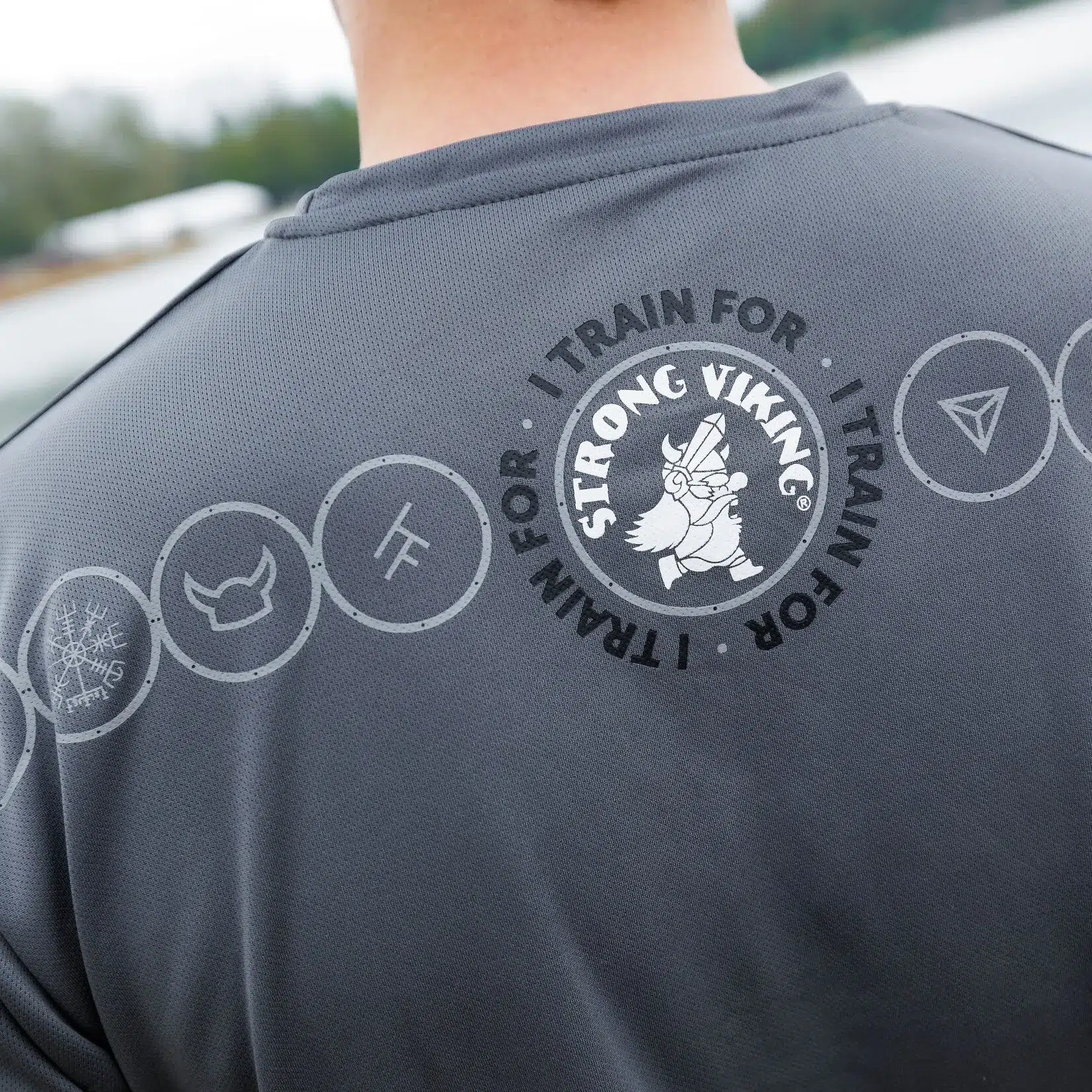 A neutral shade of grey has been chosen as the base colour, giving both a cool and stylish effect. In addition, the grey colour makes dirt and sweat less visible which is ideal for a good Strong Viking workout. This ‘I TRAIN FOR’ Strong Viking performance shirt reminds you of the challenge you are taking on. On the chest you see the Strong Viking logo which makes you part of the powerful Viking community. On the back, the logos of all Strong Viking distances shine. This addition gives you the motivation to always get the most out of your workouts, whether you choose the 4km or the 42km!